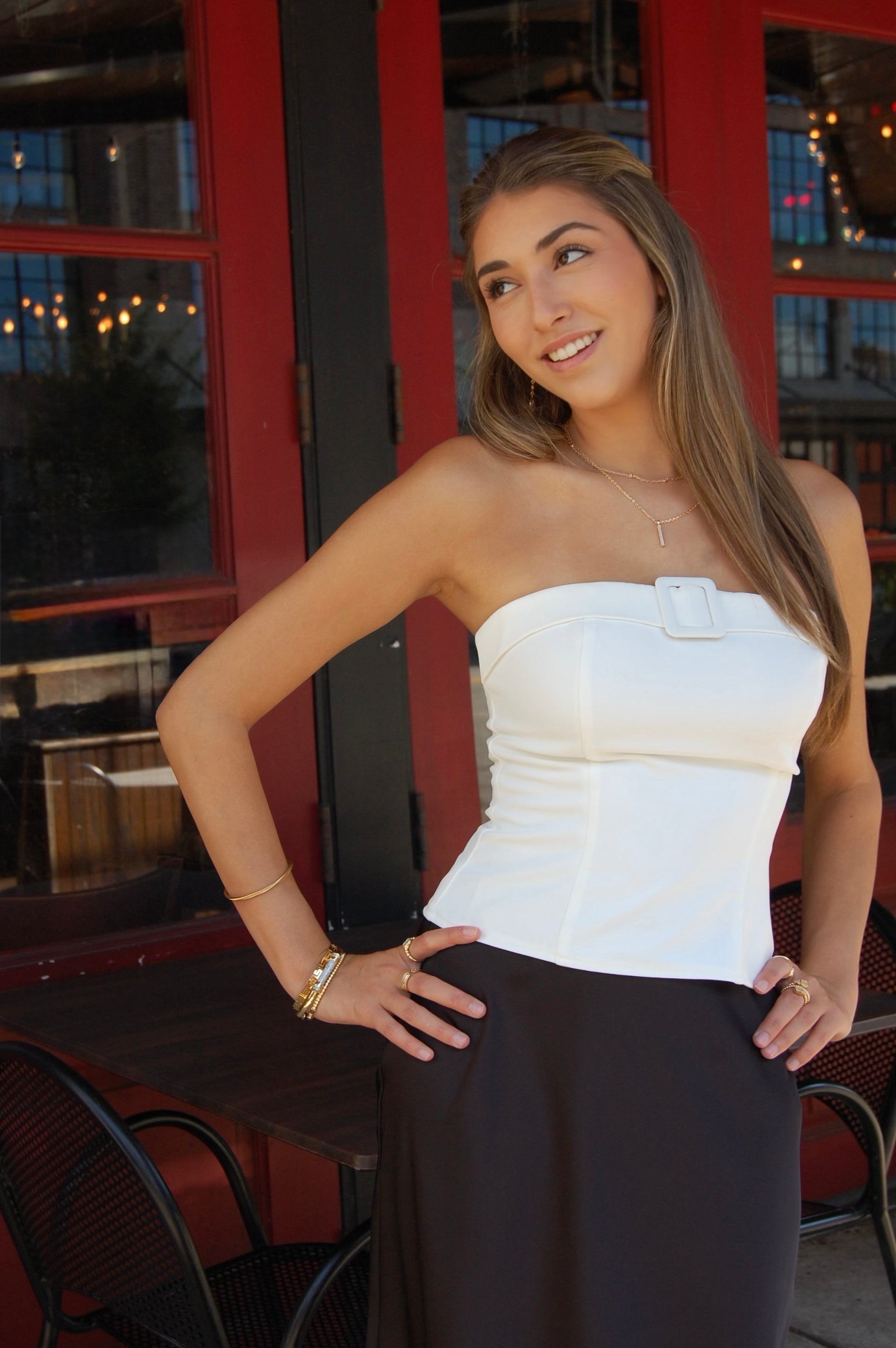 This buckle detail strapless tube top effortlessly combines style and comfort. With its sleek design and secure buckle closure, it offers both an elegant look and a secure fit. Perfect for any occasion, this top is a must-have for any fashion-forward wardrobe.