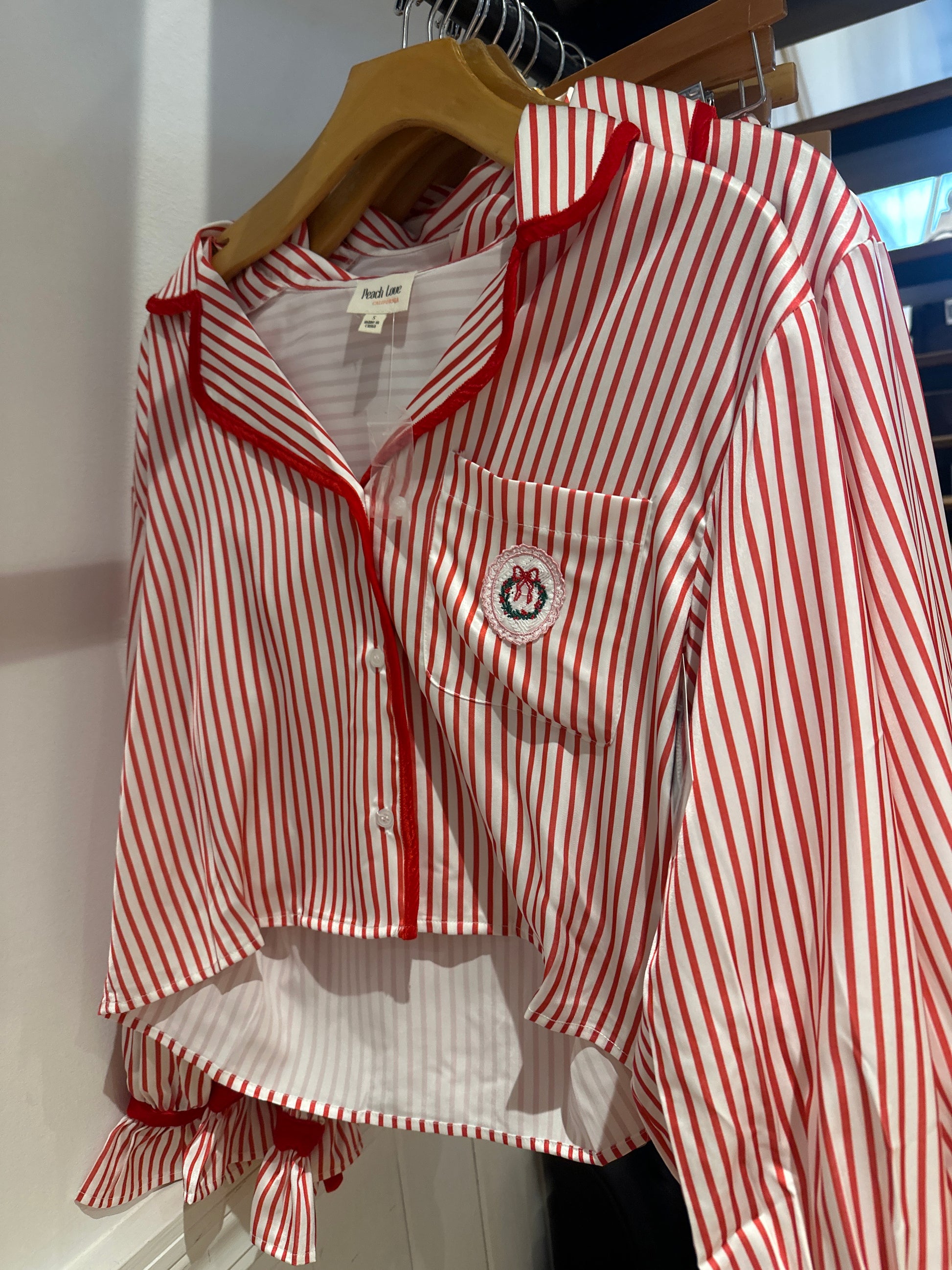 This Christmas Wreath PJ Top Set features soft velvet binding and intricate mini embroidery detail on a striped pattern. Perfect for festive lounging, this set combines comfort and style.