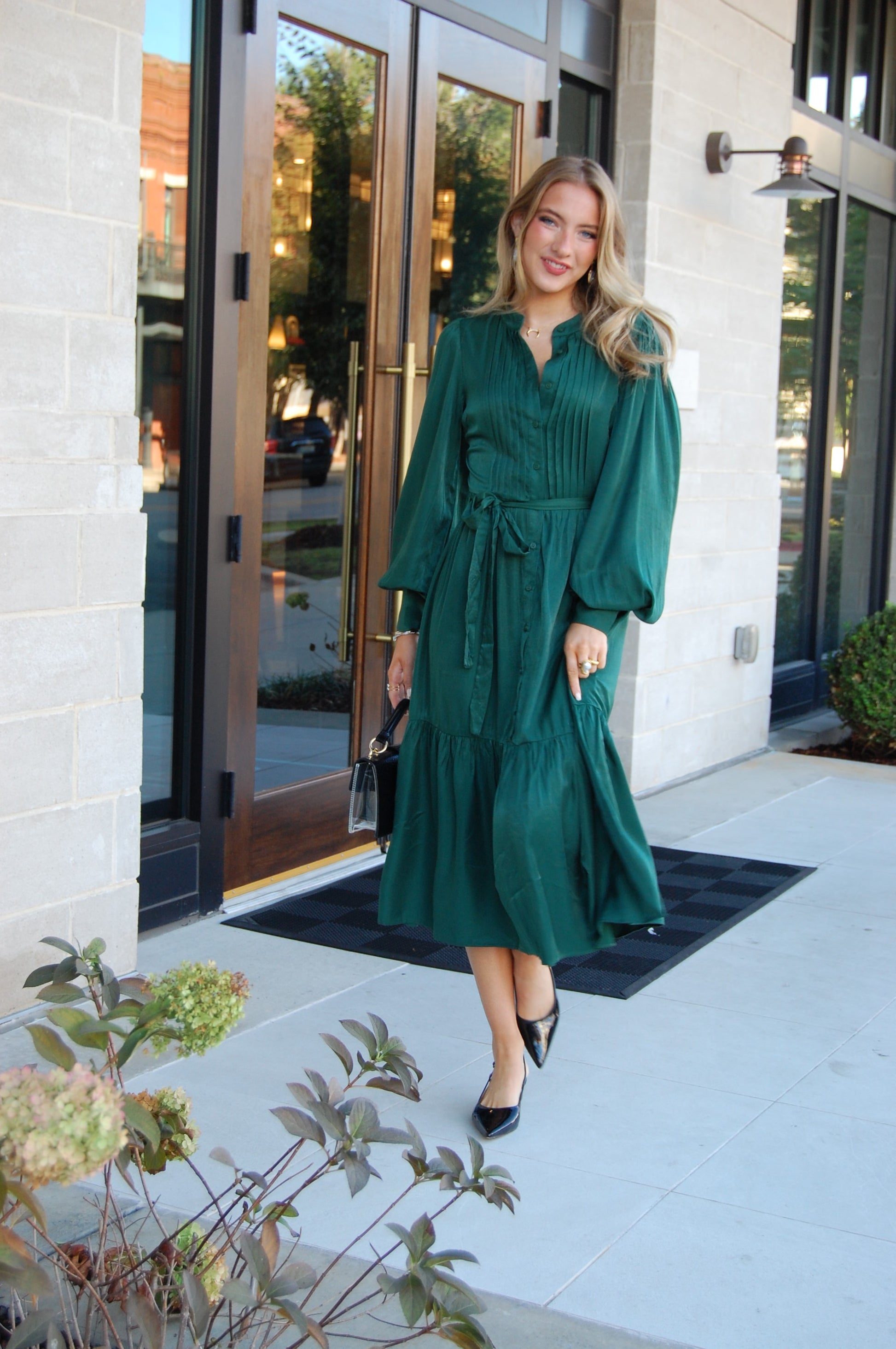Introducing the Amelie Midi, a solid woven mini dress featuring a round neckline, long sleeves with cuff bottoms, pleating detail, and a self-tie button down. The ruffled hemline adds a touch of elegance to this versatile dress, perfect for any occasion.