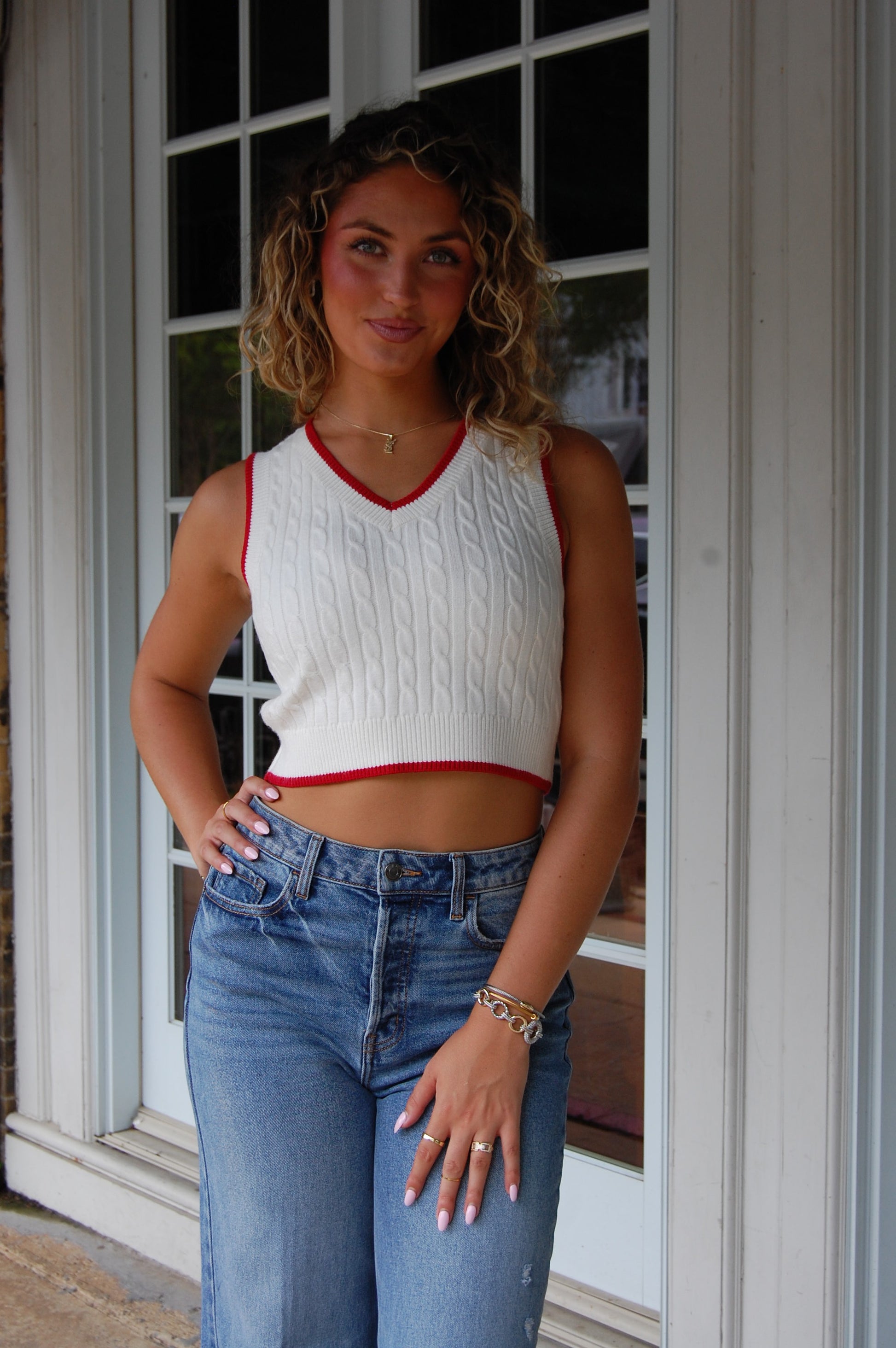 Expertly crafted for a comfortable fit, this Gameday Sweater Vest is the perfect addition to your wardrobe. Made with a soft cable knit design, this sleeveless v-neck vest features subtle contrast detailing for a touch of style. Stay warm and stylish on gamedays with this must-have piece.
