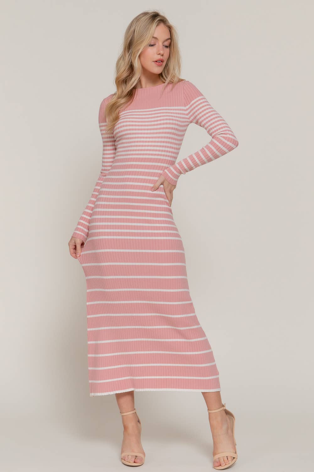 The Joni Dress is a stylish and versatile option for any wardrobe. With a long sleeve design and flattering boat neck, it offers a semi A-line silhouette that flatters all body types. Made with soft, stretchy fabric, it also features a timeless stripe pattern that never goes out of style. Upgrade your wardrobe with this must-have dress.