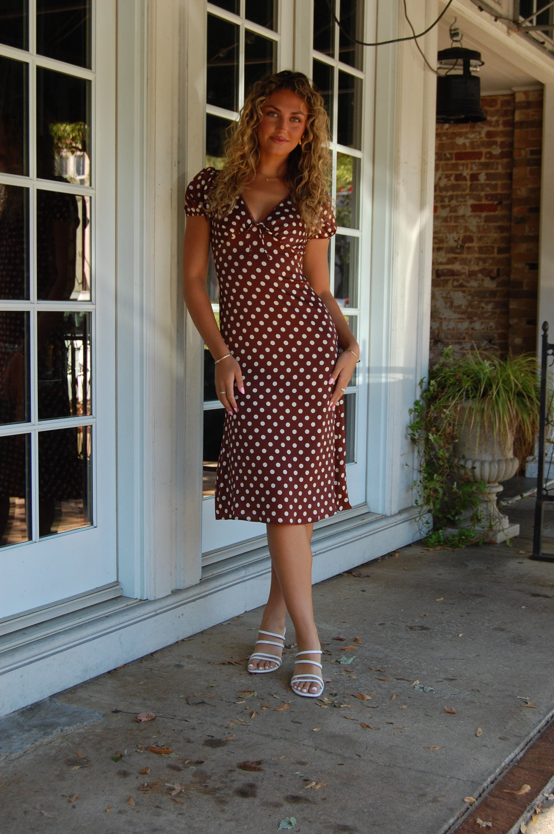 Playfully chic and effortlessly feminine, this polka dot midi dress is a timeless statement piece. Designed with a flattering V neckline and tie front detail, it features flutter sleeves and a flowy A line silhouette that moves with ease. The classic dot print on a rich brown base makes it a versatile style that works for any season.
